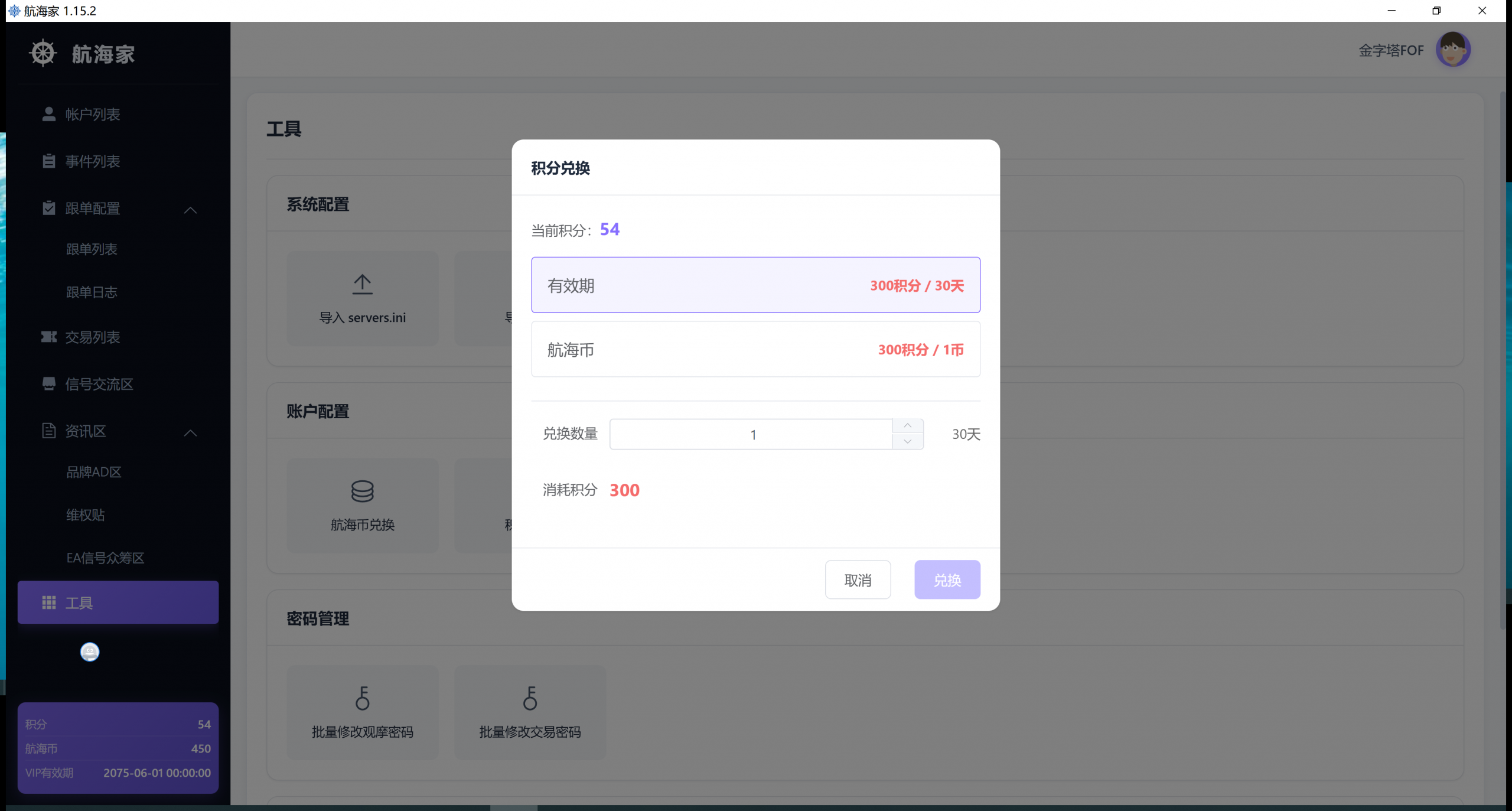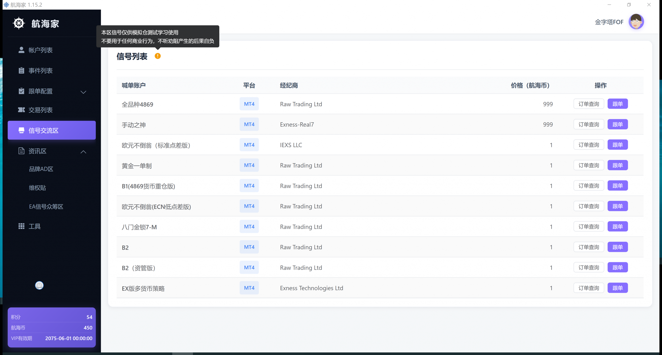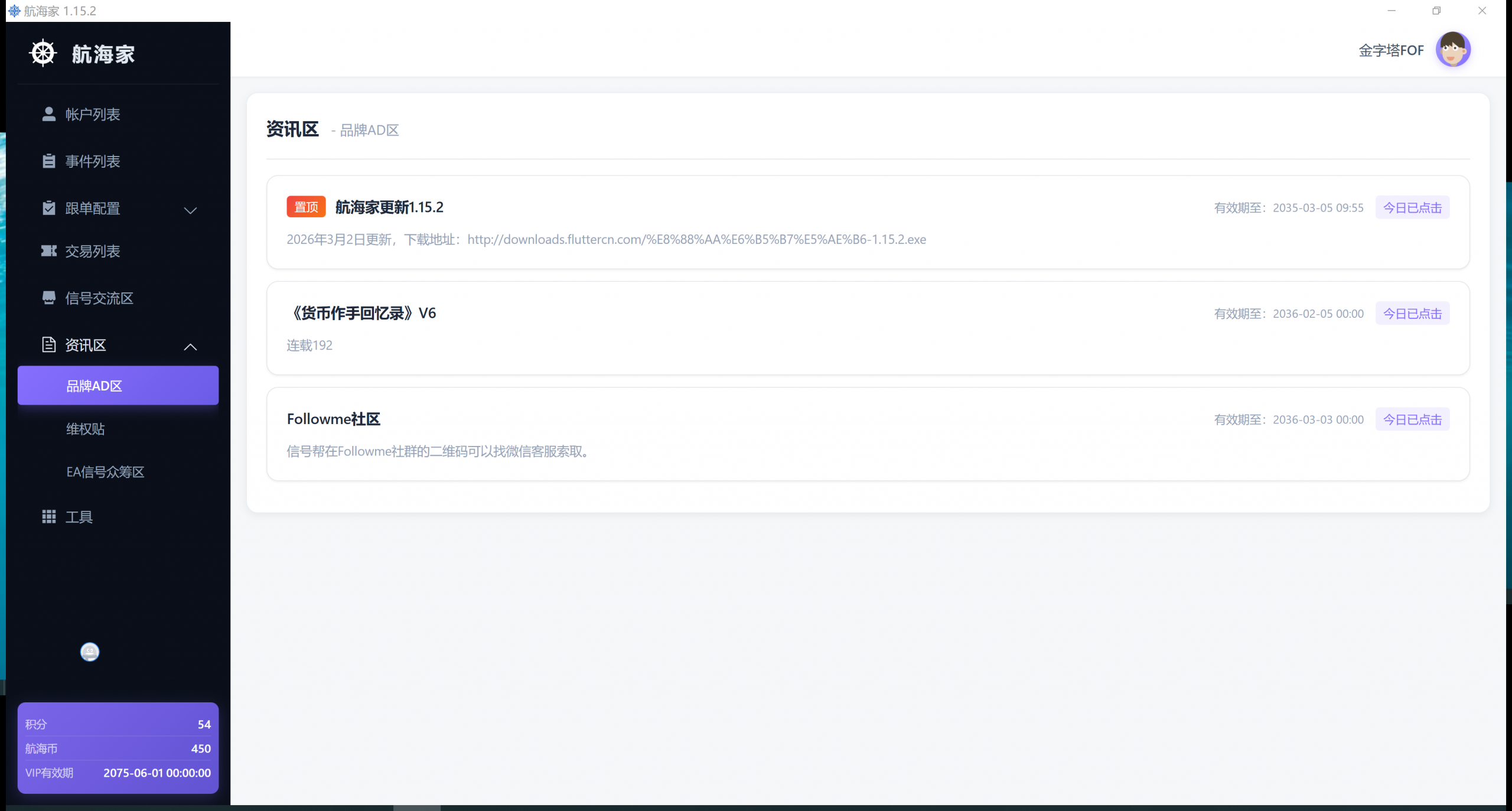 第三步:打开资讯区,点击帖子可以获得积分,积分可以在工具栏里找到“积分兑换”的按钮兑换VIP或者航海币跟单。